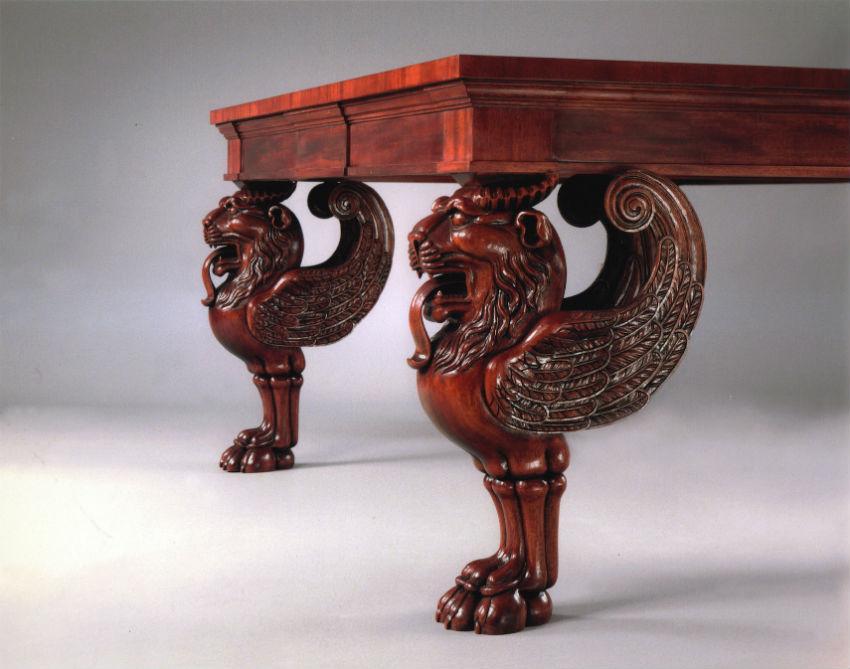 Carved out of mahogany, the richly carved table legs depict a rather comic lion’s head and terminates with a lion’s claw foot. A New York architect was commissioned to produce three massive (5’ x 11’) tables supported by the suitably massive lion’s head feet. The tables were fabricated by furniture maker VCA, Inc. in Northampton, MA and Dimitrios carved the legs for each. Much later, one of the tables found its way into a home in Florida, which was sold. The new owner asked if he could buy the table as well as the house, and was refused. He took a picture, researched the provenance and origin of the table and then commissioned VCA and Dimitrios to produce a fourth lion’s head table.