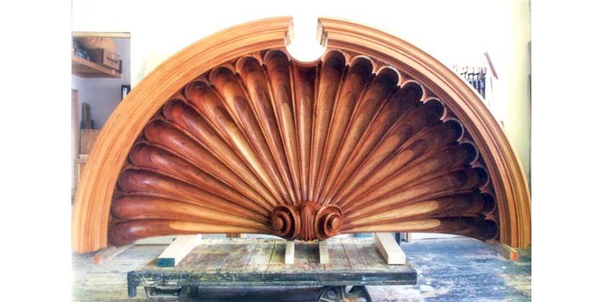 Measuring roughly 9 feet by 5 feet by 1 feet (in depth), this shell overdoor awning was carved from solid mahogany and set over double doors in Long Island, NY. The design came from the architect. The millwork fabricator glued up the blank to be 12” thick out of multiple pie shaped pieces and added the bent cornice afterwards.